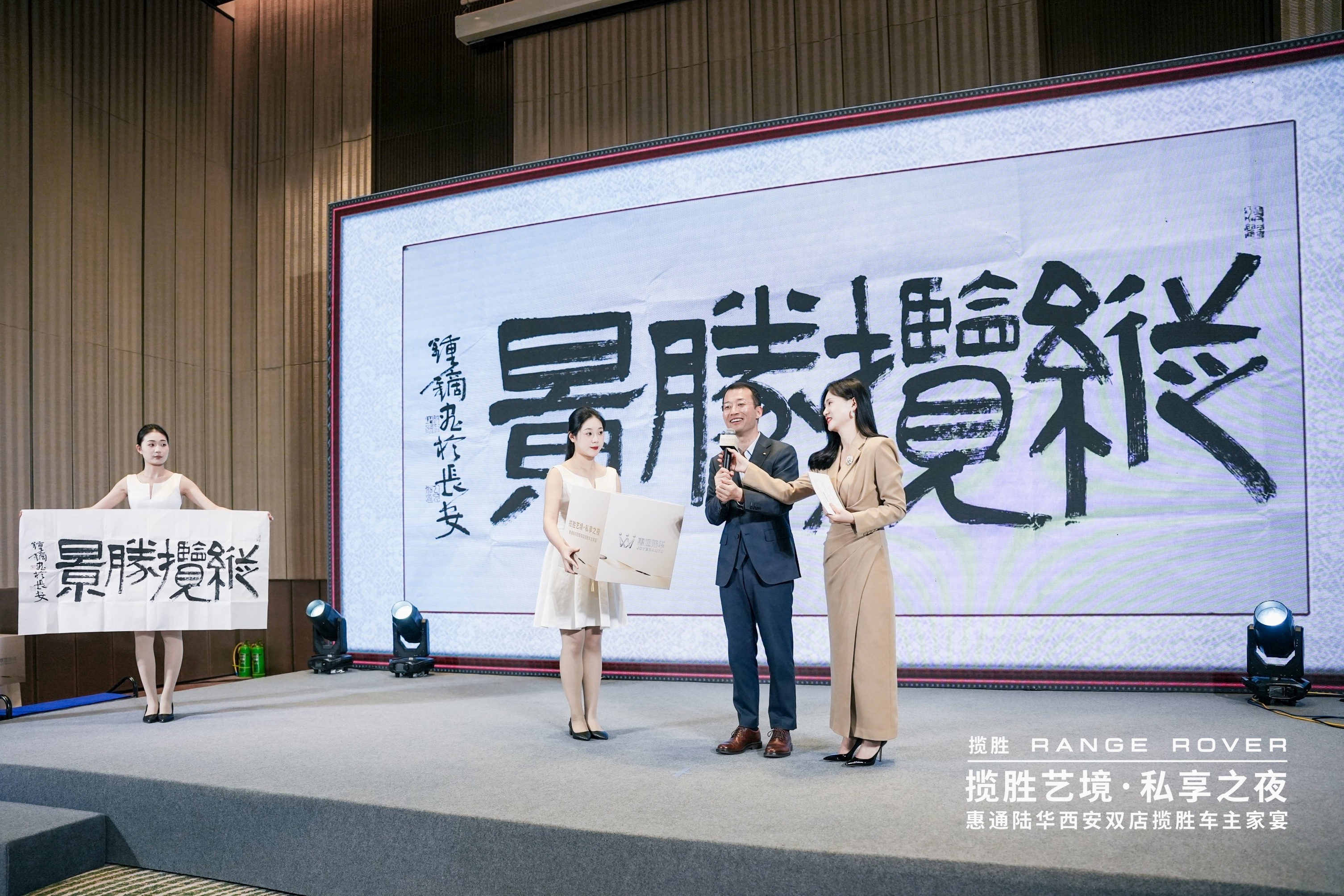 美好同鉴,精彩共享,家宴在欢快的氛围中开启了幸运抽奖互动,一揽胜境奖、胜为典范奖、揽胜天下奖、温情相伴奖系列奖项纷纷开启,精美奖品:书法作品、揽胜精品车模、路虎主题公仔一一赠送,每一轮抽奖都带来惊喜,每一份奖品都传递心意,也记录着一份独专属的幸运。